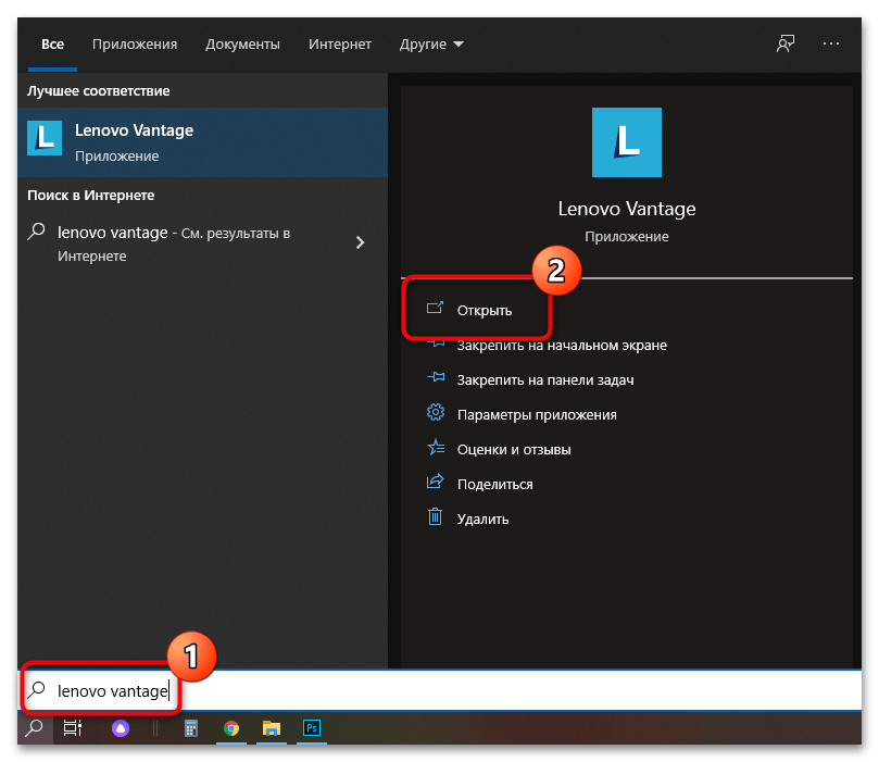 - Найдите фирменное приложение «Lenovo Vantage» через системный поиск.