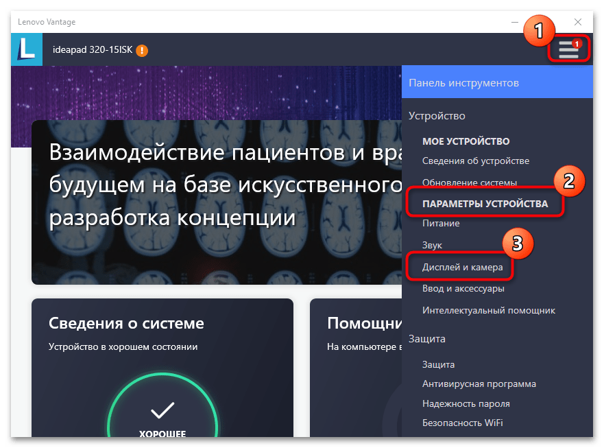 Если не работает встроенная камера на ноутбуке Lenovo, причиной могут быть неправильные настройки в программе Lenovo Vantage. Для восстановления работоспособности сделайте следующее: