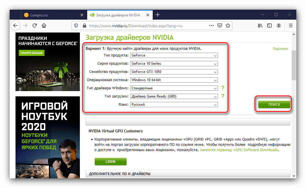 - Первым делом загрузите последний актуальный набор программного обеспечения для вашего GPU – подробно останавливаться на этой процедуре не будем, так как на нашем сайте уже есть подходящая инструкция.