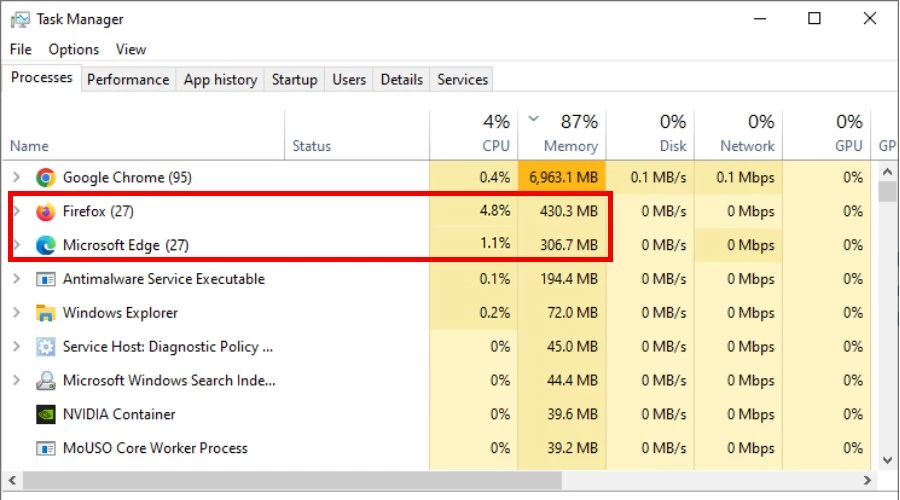 Во время тестирования с несколькими открытыми вкладками мы обнаружили, что Edge занимает около 300 МБ ОЗУ и только 1% четырехъядерного процессора с частотой 3.4 ГГц.