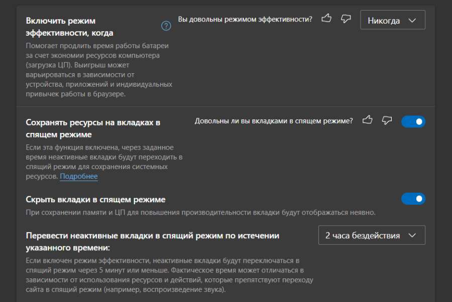 В настройках присутствует целый раздел с названием «Система и производительность», в котором мое внимание привлекла возможность регулировать перевод неактивных вкладок в «Спящий режим», выбирать время, после которого они автоматически «уснут», а также указать исключения. И, как мне кажется, это на самом деле отличное решение, так как поможет оптимизировать потребление ресурсов владельцам не самых производительных систем