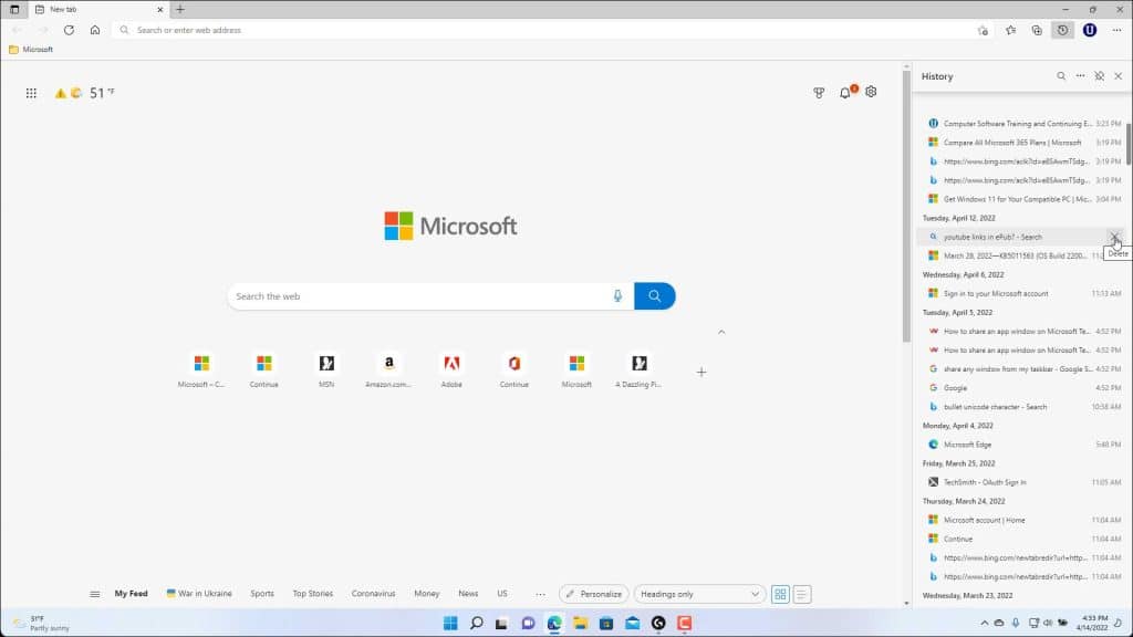 To delete a single visited page in the History pane, hover over the page to delete. Then click the “Delete” button, which looks like an “X,” at the right end of the page link in the History pane. To reopen a page in the History pane in Microsoft Edge, click any web page link.