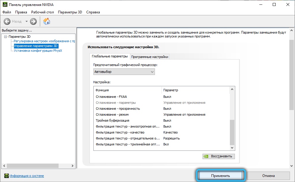 Если вы хотите отменить изменения и использовать настройки графического драйвера NVIDIA по умолчанию, вернитесь сюда и нажмите кнопку «Восстановить».