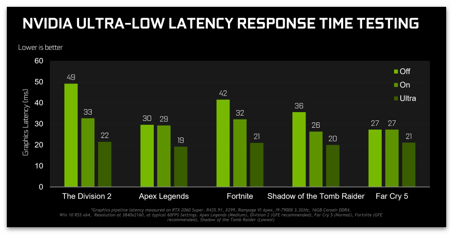 По заявлениям разработчиков Нвидиа, активация режиме Low Latency даёт преимущества в ряде игр. В частности, в популярной « Apex Legends » данная опция снижает графическую задержку с 30 до 19 миллисекунд .