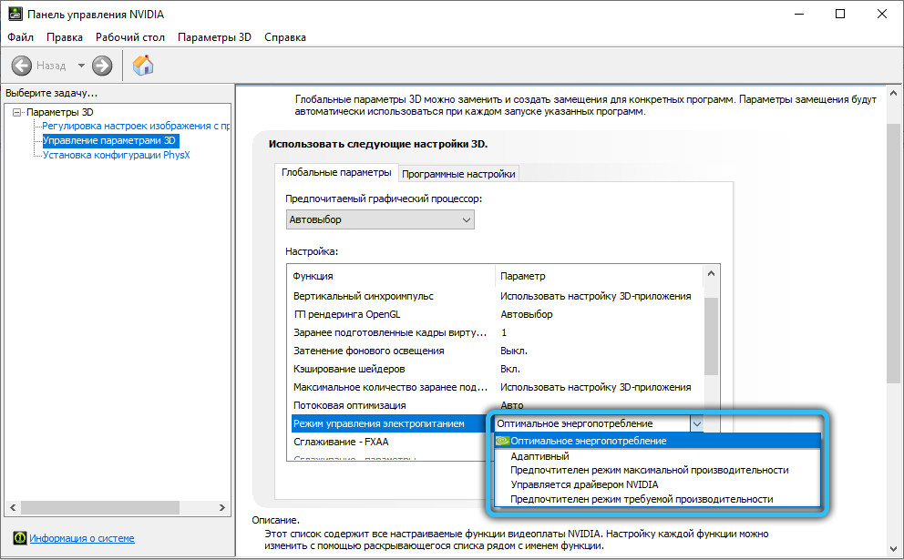 В зависимости от версии драйвера или самой видеокарты, вид и функциональность утилиты могут отличаться, но в любом случае в левой панели нужно выбрать пункт «Управление параметрами 3D» (вкладка «Параметры 3D»). В правой панели ищем пункт «Режим управления электропитанием», кликаем по нему и выбирает нужный вариант, подтвердив свой выбор нажатием кнопки «Применить».