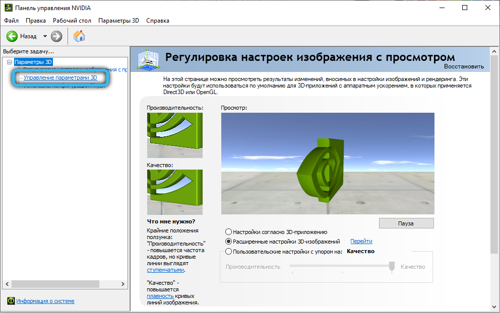 - В открывшейся панели слева выберите подраздел « Управление параметрами 3D ».