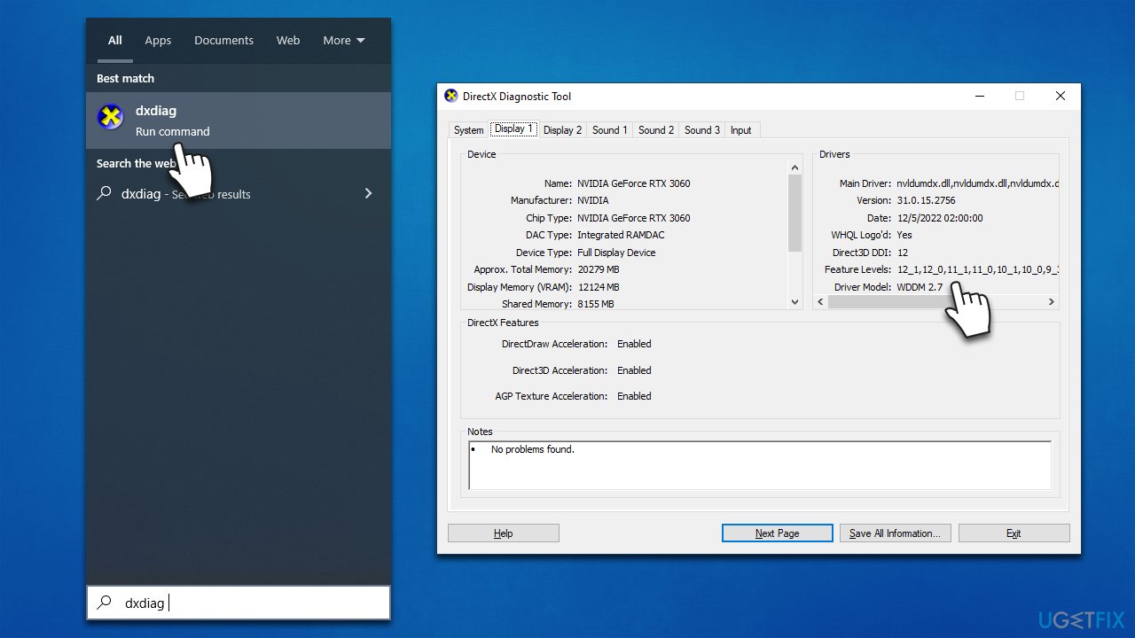 - Выберите dxdiag из результатов поиска. Откроется средство диагностики DirectX.