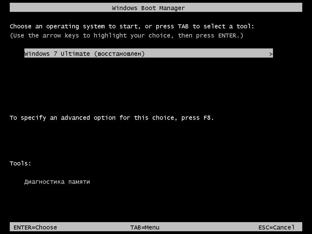 ». После чего начнется поиск неполадок и восстановление загрузчика Windows 7. При успешном восстановлении загрузочной записи вы увидите окно загрузчика, в котором будет ваша восстановленная ОС, как на рисунке ниже.