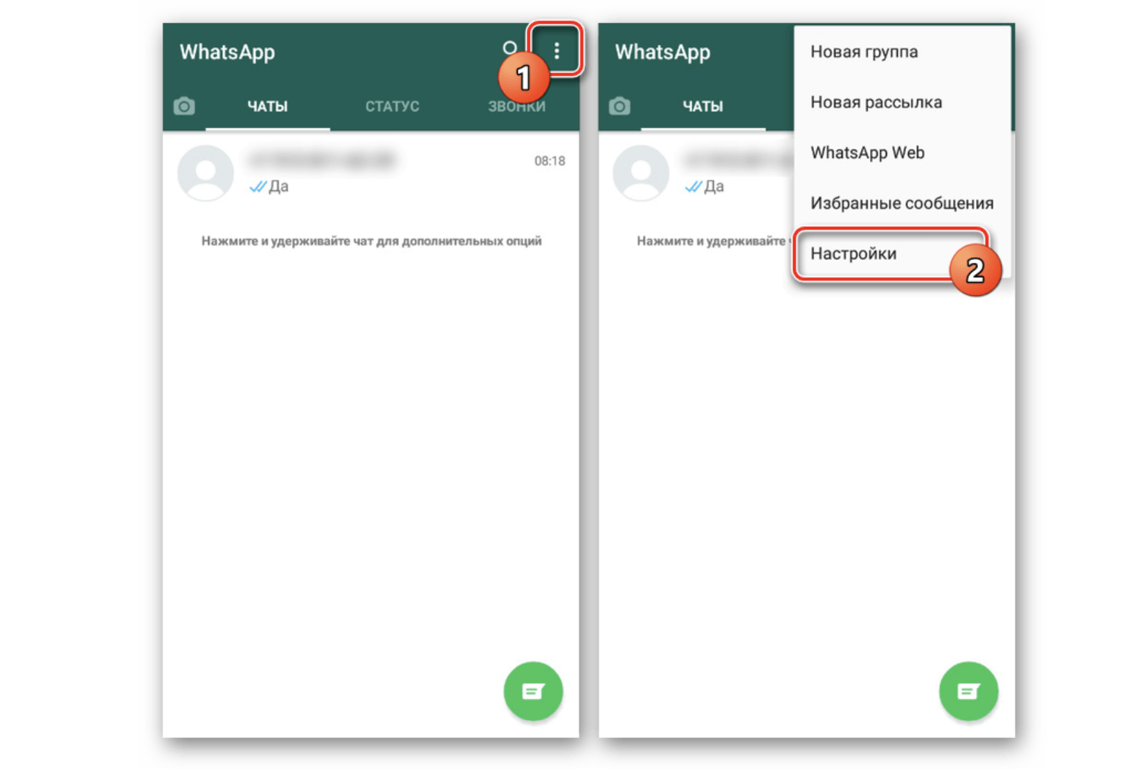 - В приложении WhatsApp открыть меню и выбрать пункт «Настройки»;