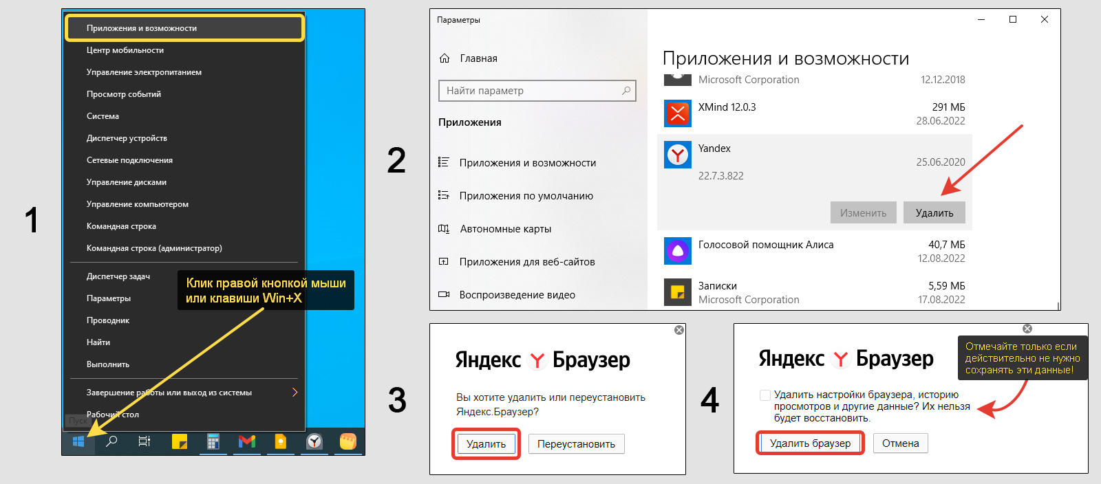 - Из открывшегося списка удалите Яндекс браузер, следуя указаниям на экране.