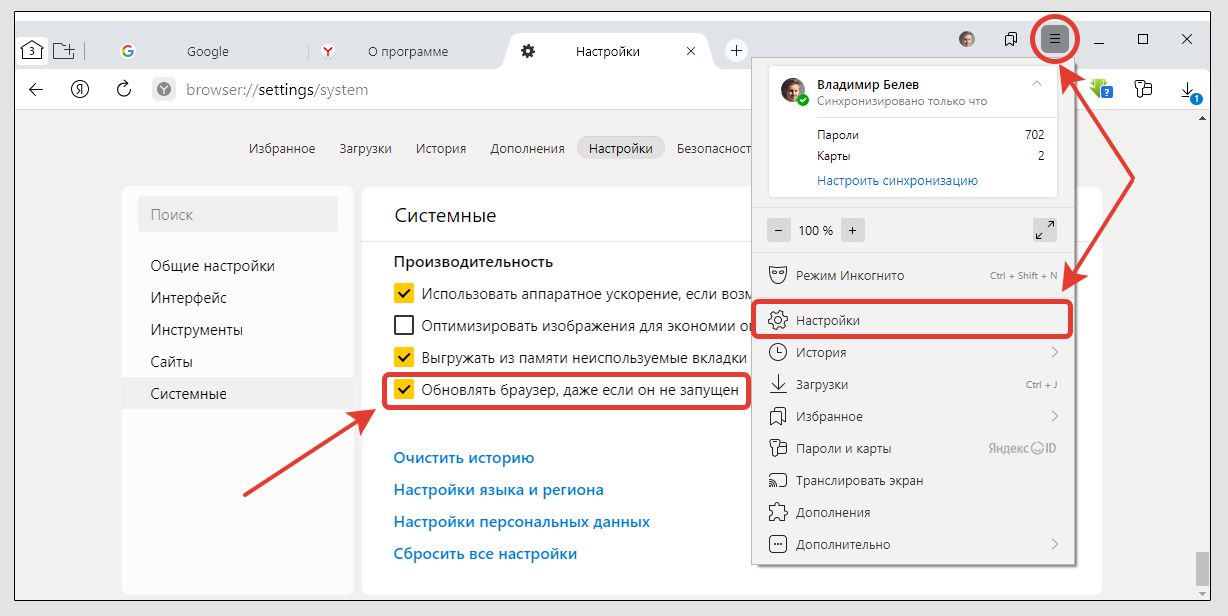 Либо можете обновиться по вышеописанной схеме — через настройки в меню браузера.