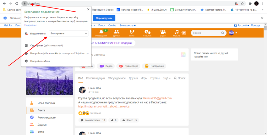 Чтобы отключить оповещения в браузере, достаточно открыть одноклассники и в верхней части кликнуть по кнопке в виде замочка. Затем напротив строки «Уведомления» установить значение как «Блокировать».
