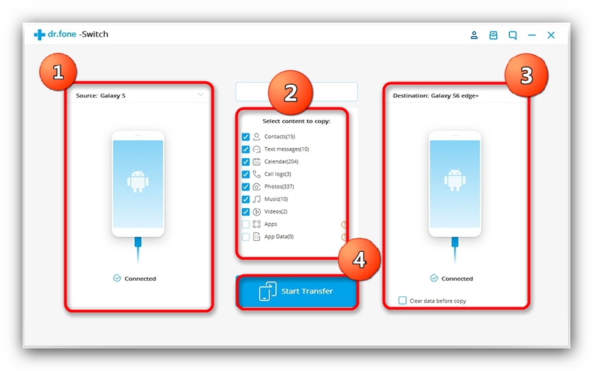Небольшая утилита от китайских разработчиков Wondershare, которая позволяет всего в пару кликов перенести данные с одного Android-смартфона на другой. Само собой, программа совместима и с девайсами Самсунг.