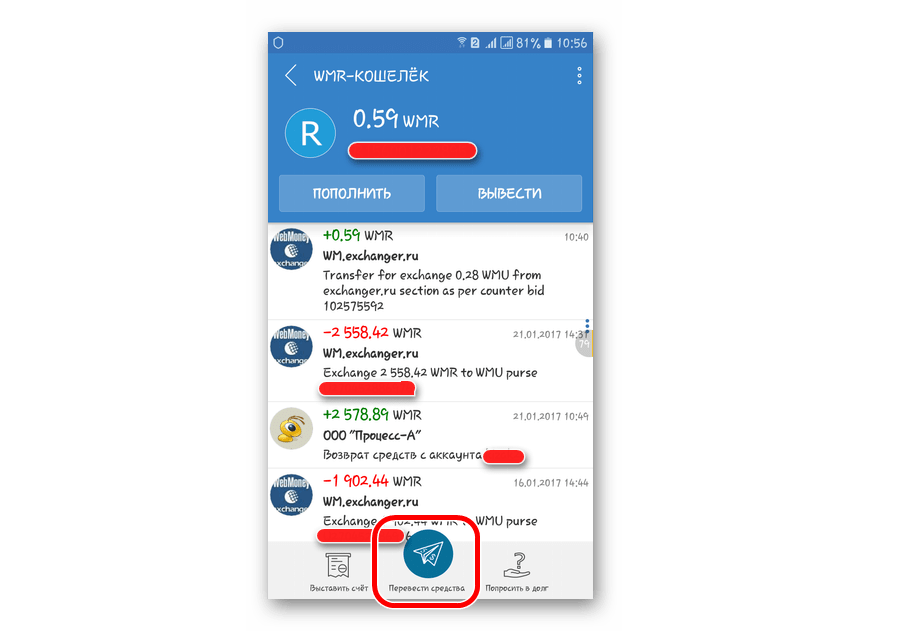 Мобильная версия кипера используется для отслеживания входящих транзакций, переписки и мелких платежей. Есть версии под iOS, Android, Blackburry, Windows Phone. Для перевода в приложении Вебмани необходимо сделать следующее: