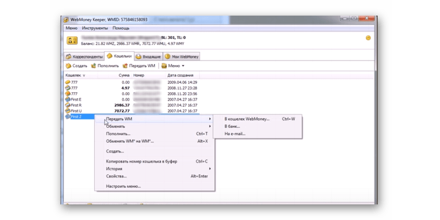 - После авторизации необходимо переключиться на вкладку кошельков и на том кошельке, с которого будет производиться перевод, нажмите правой кнопкой мышки. Появится выпадающее меню, в котором нажмите на пункт «Передать WM». Появится еще одно выпадающее меню. Здесь уже нажмите на пункт «В кошелек WebMoney…».