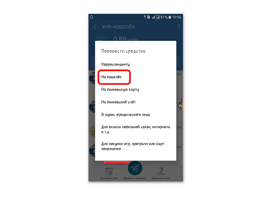 Чтобы с вебмани перевести на вебмани через мобильное приложение, необходимо авторизоваться в аккаунте и на главной странице нажать кнопку «Перевести». Далее откроются все доступные варианты, следует выбирать «На кошелек»:
