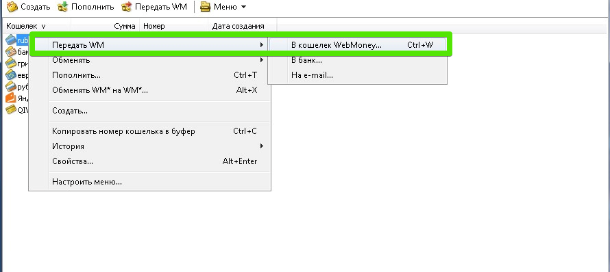 - Кликают правой кнопкой мыши по кошельку, с которого необходимо перечислить деньги.