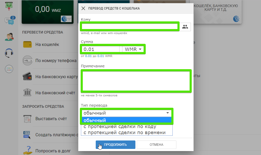 Далее вводятся реквизиты получателя: WMID/номер кошелька/адрес электронной почты (при условии, что второй человек также использует WM Keeper Standart), указывается сумма перевода и примечание по желанию. Можно задать тип операции «Обычная» или с протекцией: