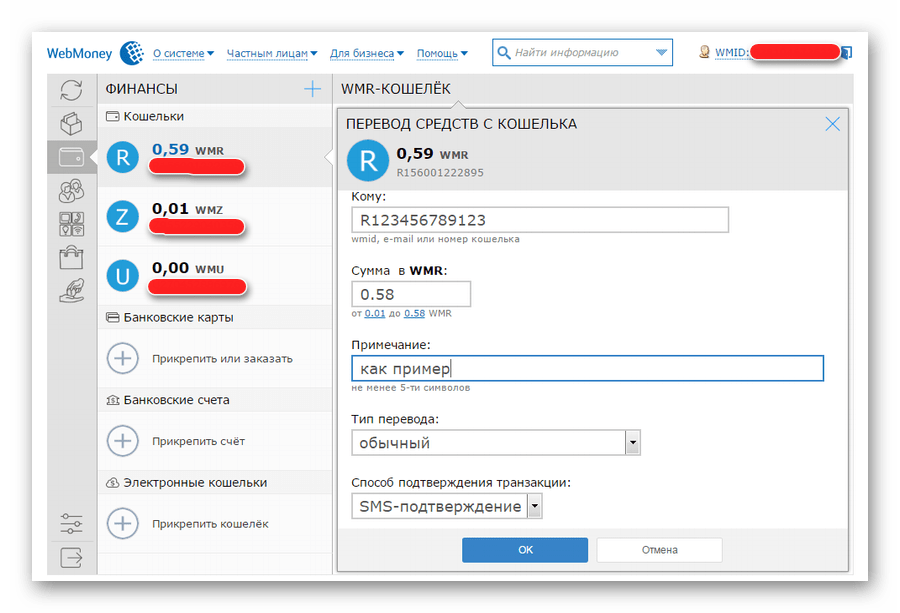 - Перед Вами откроется меню «Перевод средств с кошелька». В нем Вам нужно будет указать: кому перевод (WMID получателя или номер кошелька), сумму перевода, примечание, тип перевода и способ подтверждения транзакции. После заполненных полей, нажать кнопку ок.