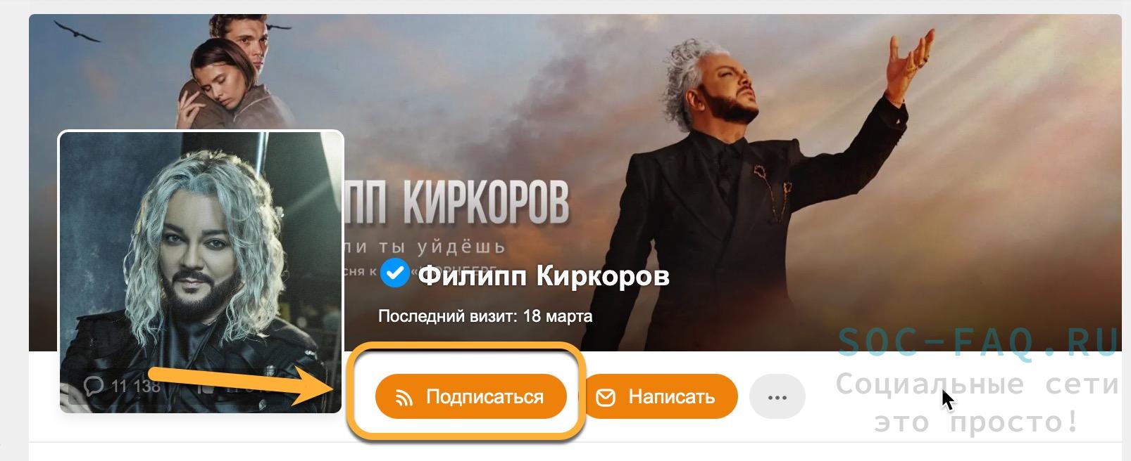 - Правее аватарки хозяина страницы есть оранжевая кнопка “Подписаться”. Жмем на нее. Готово.