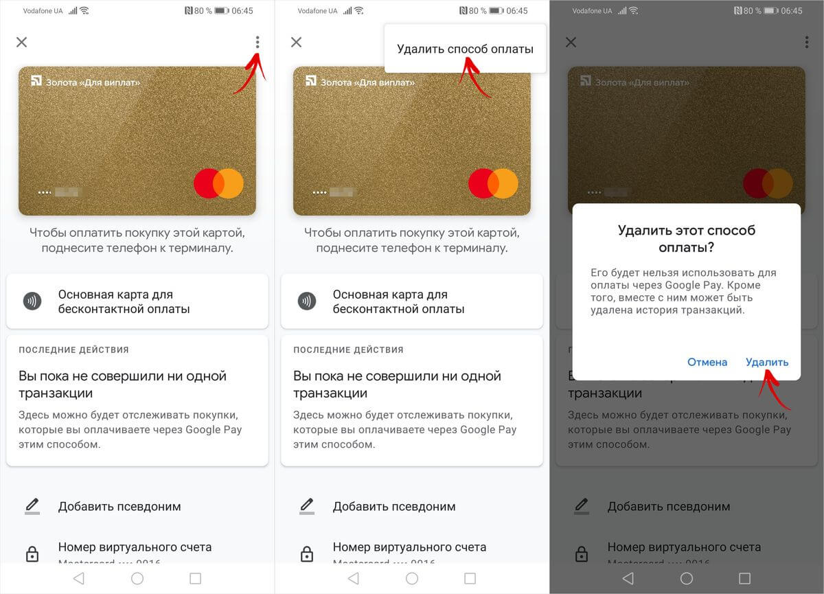 Чтобы удалить банковскую карту в приложении Google Pay, перейдите в раздел «Оплата» и выберите карту. Затем нажмите кнопку «Меню», расположенную в правом верхнем углу экрана, и нажмите «Удалить способ оплаты». Когда появится запрос «Удалить этот способ оплаты?», Выберите «Удалить».