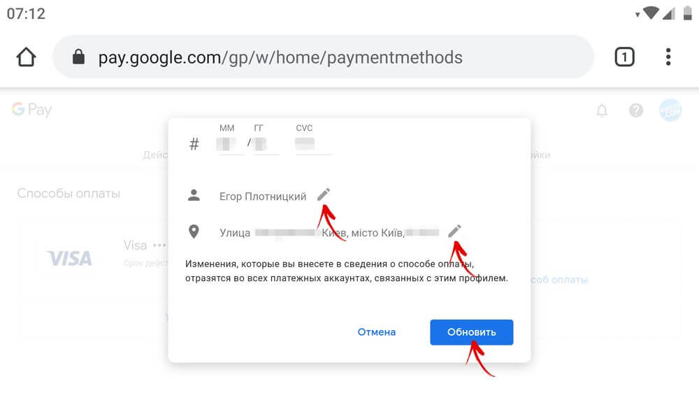 Если вы хотите изменить данные добавленной карты, перейдите на сайт pay.google.com, перейдите на вкладку «Способы оплаты» и нажмите кнопку «Изменить» рядом с вашей кредитной картой. Далее отредактируйте необходимую информацию, введите код CVC и нажмите «Обновить».