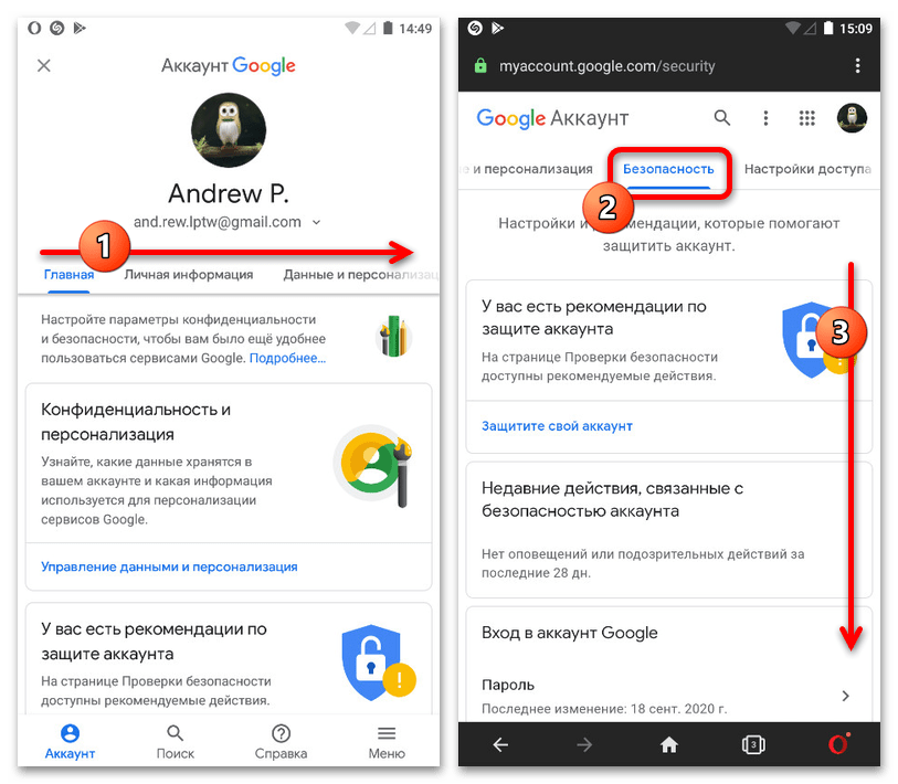 - На следующей странице пролистайте навигационное меню влево и выберите раздел «Безопасность». Аналогичное необходимо сделать и здесь, но на сей раз отыскав блок «Вход на другие сайты через аккаунт Google».