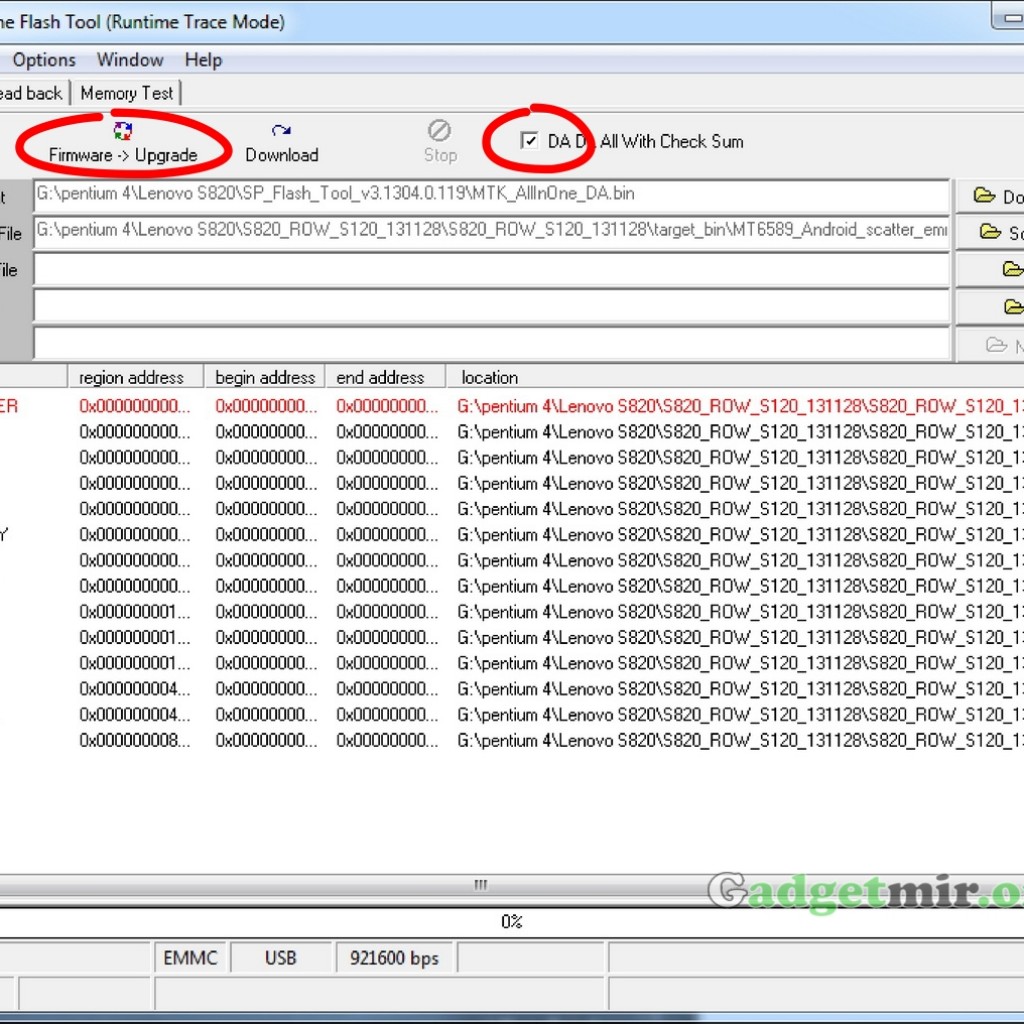 Указав путь к файлу, в нижнем поле появятся блоки, которые будут прошиваться. Нужно проследить, чтобы напротив всех блоков стояли галочки, напротив «Preloader» тоже. Далее ставим галочку «DA DL All With Check Sum» и нажимаем кнопку «Firmware->Upgrade» см. рис. 3.