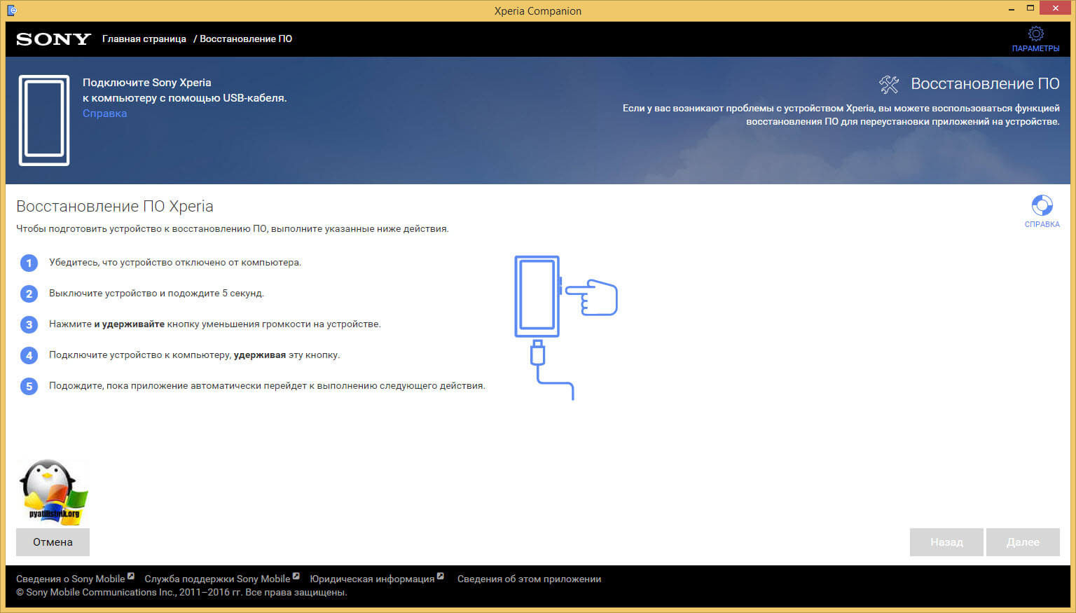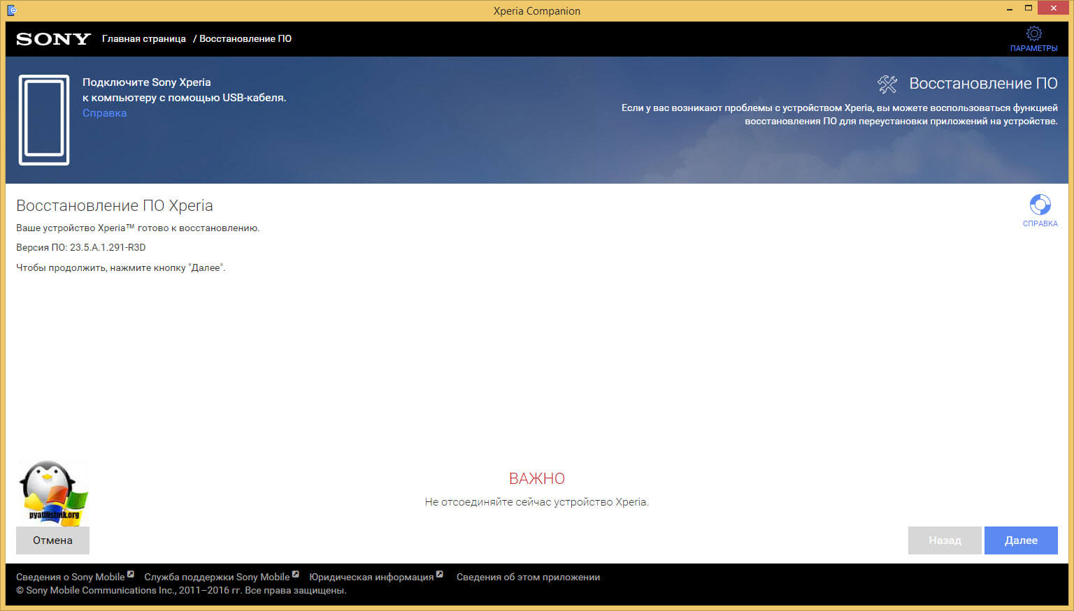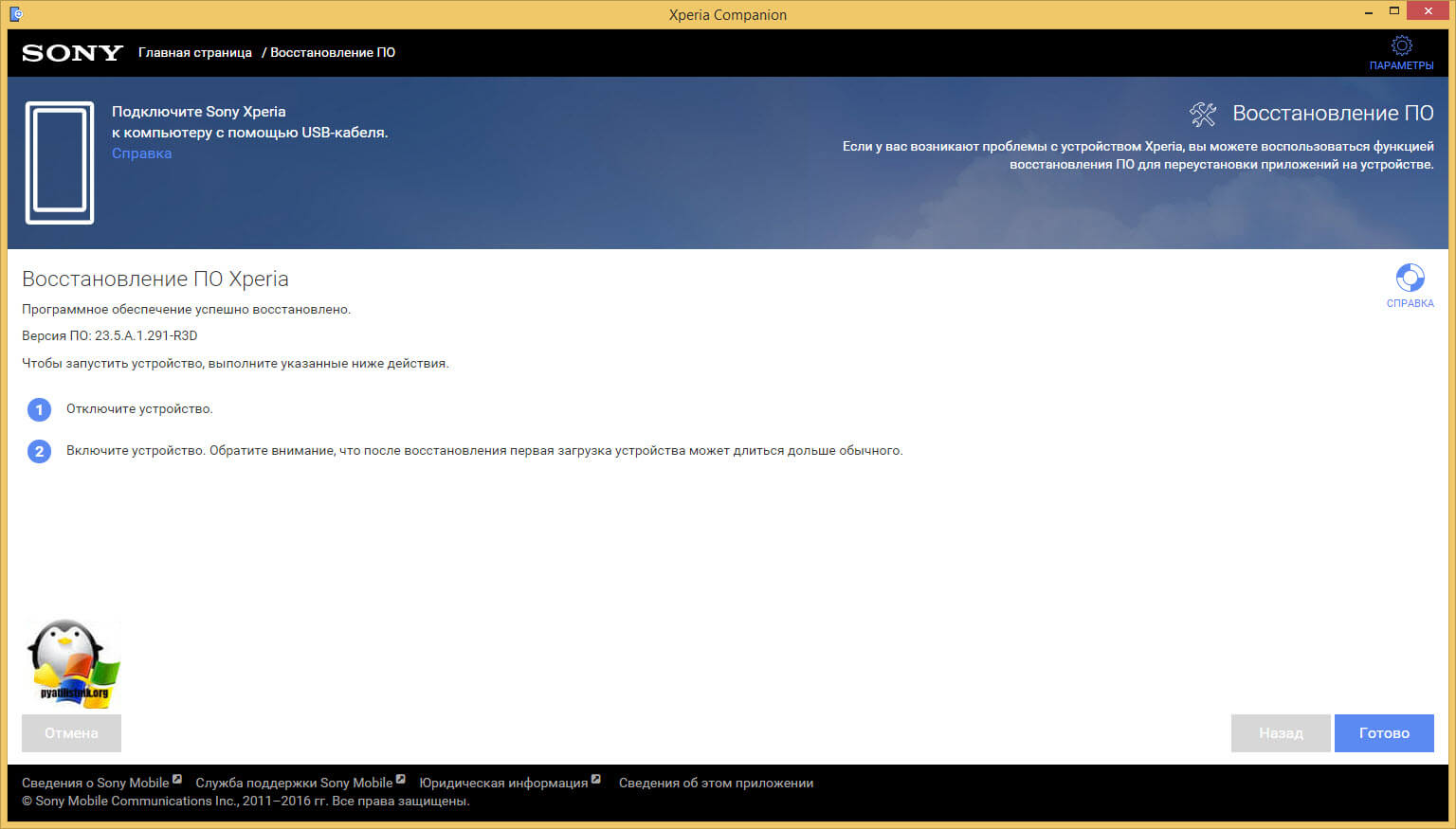 Открываем Xperia Campanion и находим пункт Восстановление ПО он как раз для таких целей и служит.