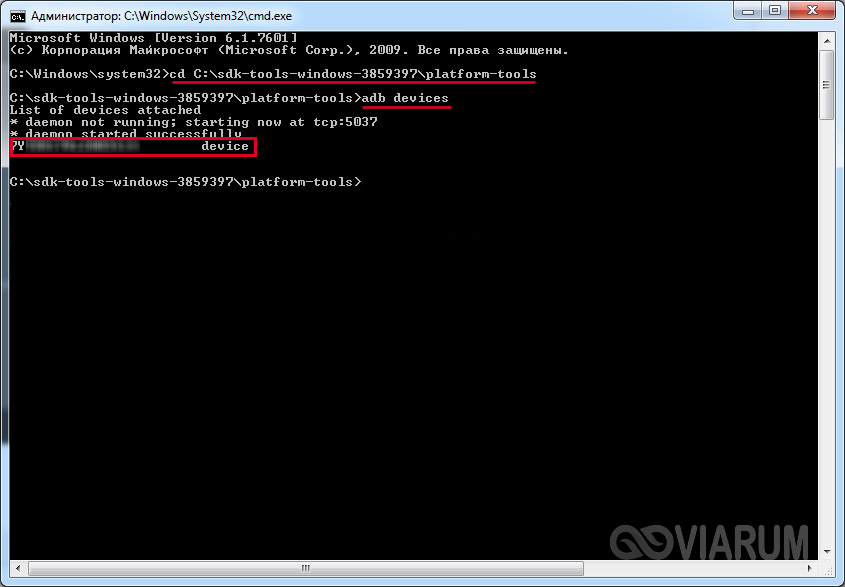 После перевода устройства Андроид в режим отладки на компьютере запускаем командную строку Windows от имени администратора и c помощью команды cd Путь_к_папке_с_ADB (например, cd C:\sdk-tools-windows-3859397\platform-tools) переходим в расположение файлов ADB и Fastboot. Здесь вводим команду adb devices, которая выведет список подключенных к ПК гаджетов с указанием серийных номеров. Если вы увидели буквенно-цифровой код и рядом слово device, значит, связь с устройством через ADB установлена, и с ним можно работать.