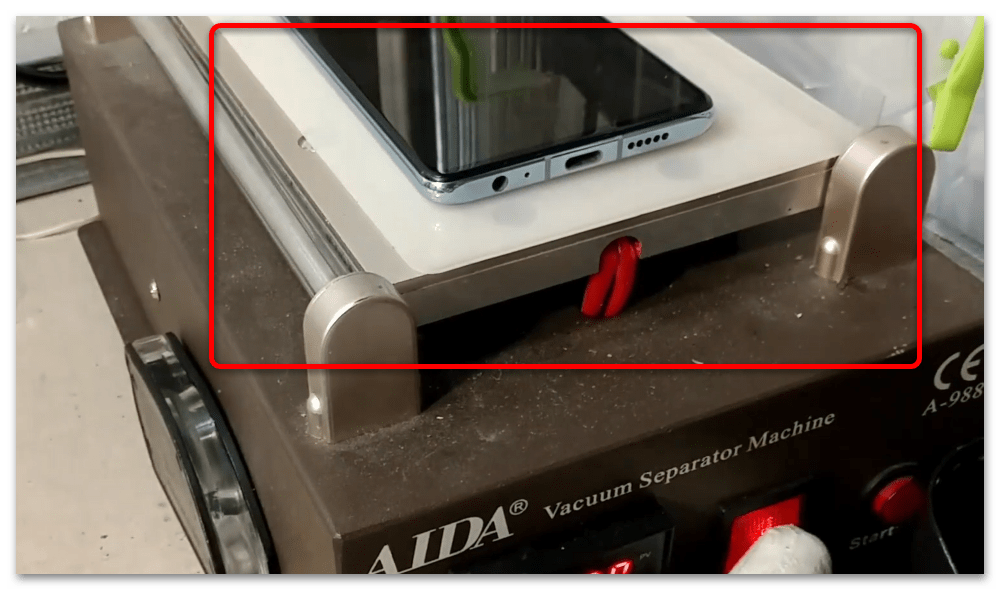 В конечном итоге клей между частями корпуса поддаётся и устройство разбирается на две основные части — заднюю крышку и модуль мобильного телефона Samsung. Когда крышка отстанет от модуля, не нужно сразу же открывать приспособление. Необходимо убрать присоску с корпуса, после чего можно открыть станок.