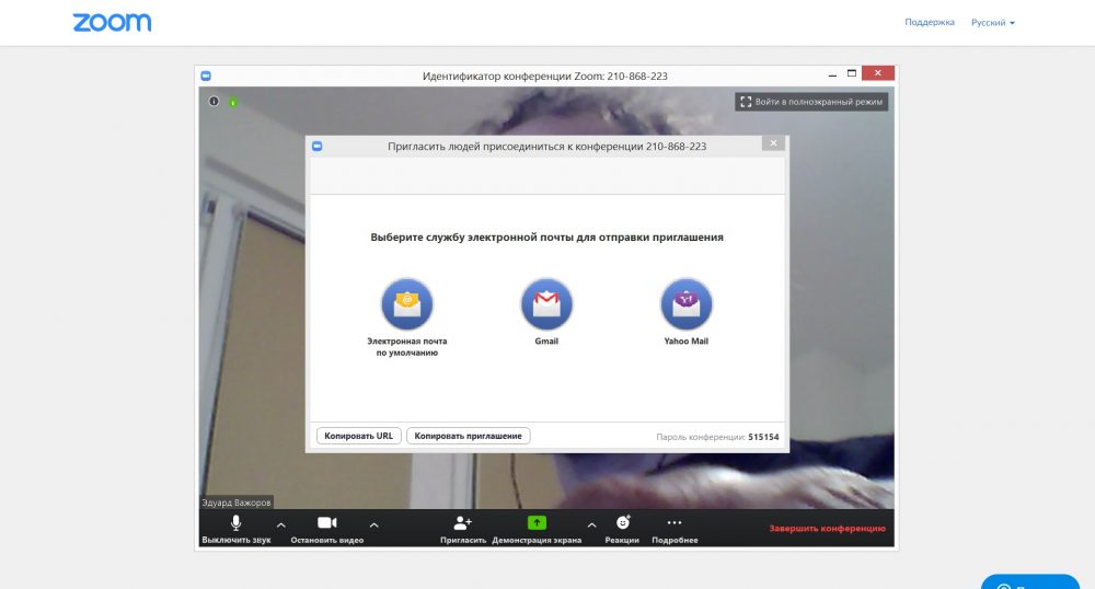 Также можно пригласить коллег, достаточно лишь ввести их электронные почты, и им придёт письмо. Можно пропустить этот шаг. Заканчивая регистрацию, вы получаете url для ваших видеоконференций.