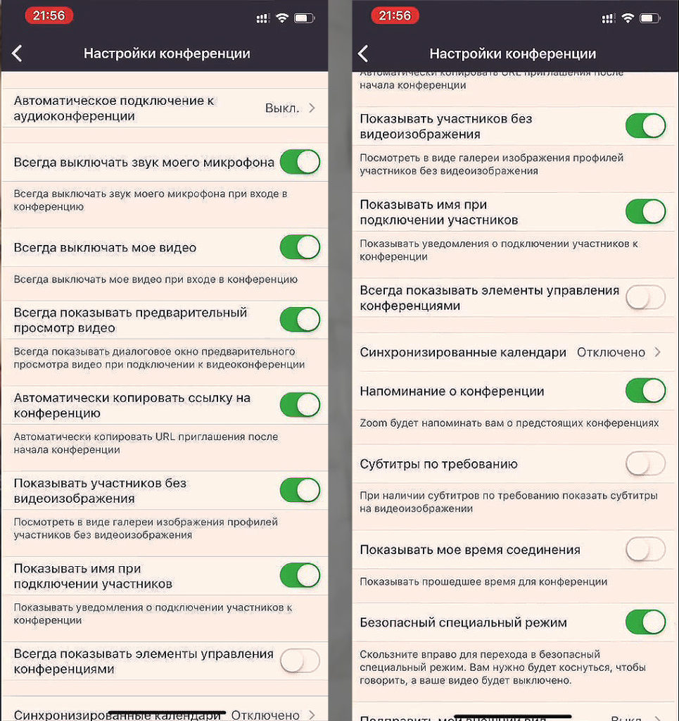 Обратите внимание, что по умолчанию опция «Отключать в конференции» влючена. Если вы хотите пользоваться чатом, его легко включить в режиме конференции (меню внизу экрана), или прямо здесь, передвинув влево ползунок напротив «Отключать в конференции».