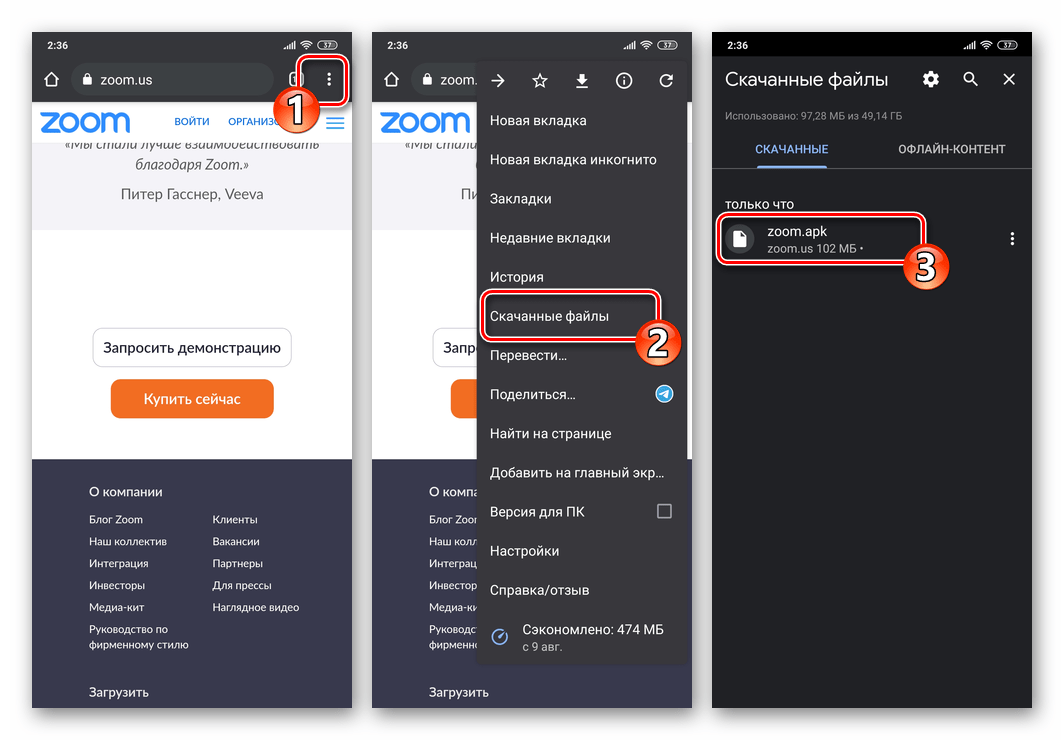 Откройте меню браузера, перейдите из него в «Загруженные файлы» и нажмите на имя файла zoom.apk.