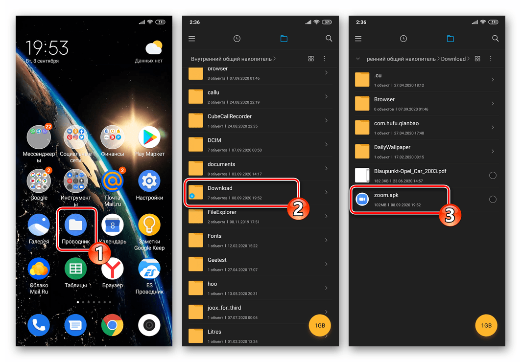 Второй вариант, который предполагает запуск процедуры установки клиента системы видеоконференцсвязи: с помощью любого файлового менеджера для Android зайдите в папку «Скачать» и откройте оттуда файл zoom.apk.