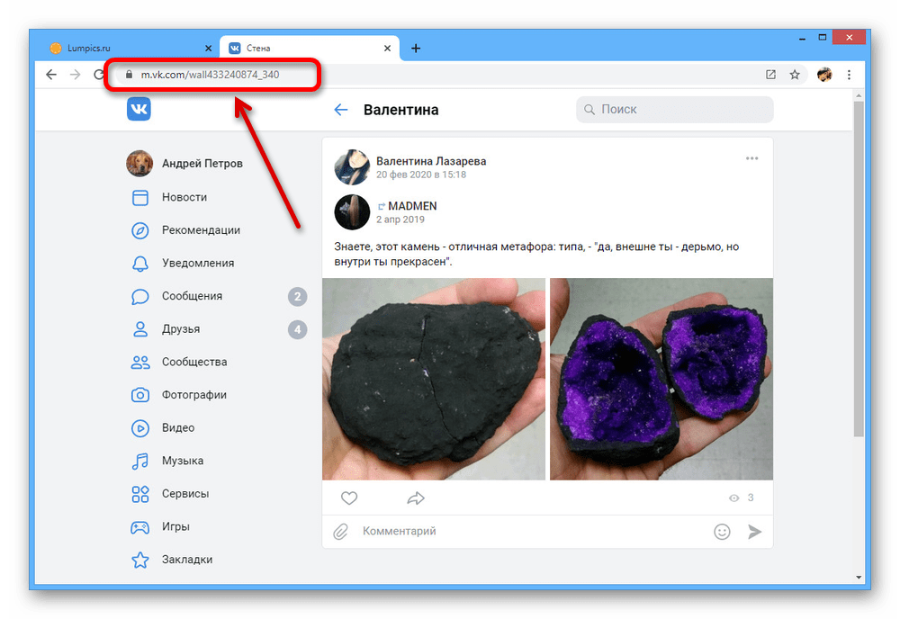 В случае с уникальным адресом, пролистайте страницу ниже до блока с любой опубликованной записью. Здесь необходимо кликнуть левой кнопкой мыши по дате публикации под именем автора.