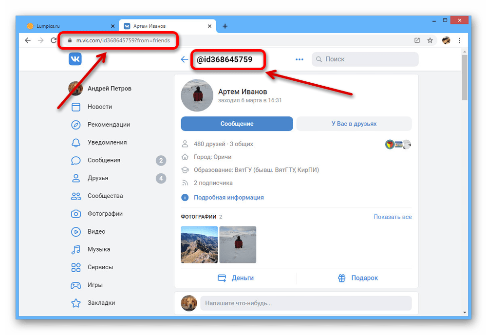 Самый простой способ узнать id у друга — это открыть нужный аккаунт в браузере и посмотреть на адресную строку, точнее, на цифры, которые идут после https://vk.com/id…