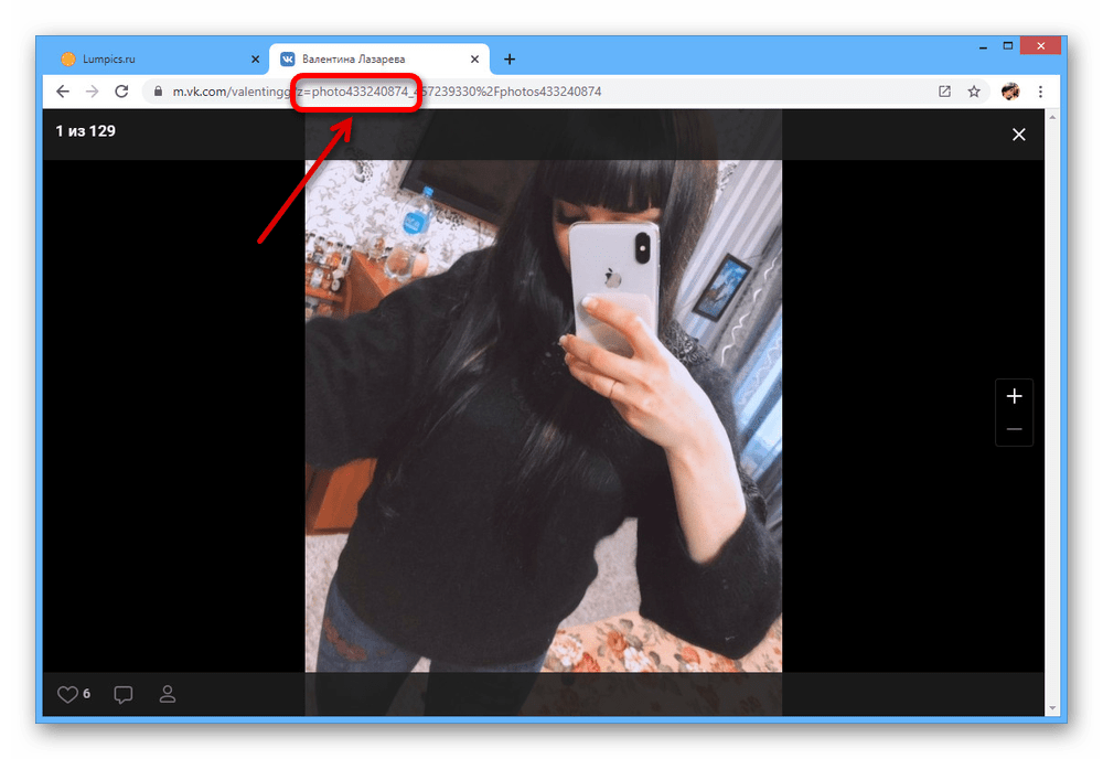 В качестве альтернативы можете открыть фотографию пользователя и точно так же обратить внимание на адрес страницы. Нужное значение находится сразу после «PHOTO»