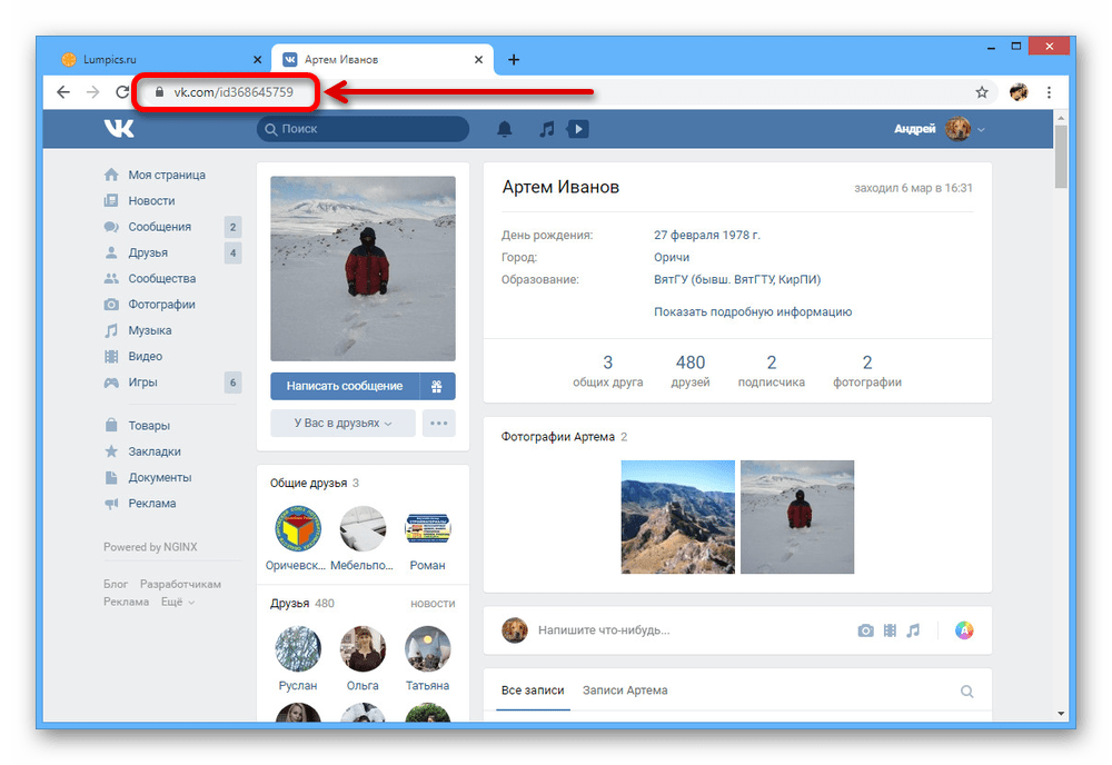 На официальном сайте ВКонтакте узнать идентификатор проще всего, так как URL каждой открытой страницы доступен сразу в адресной строке веб-браузера. Таким образом, достаточно будет перейти к анкете нужного человека, даже если он использует закрытый профиль, и посмотреть информацию в соответствующей области окна.