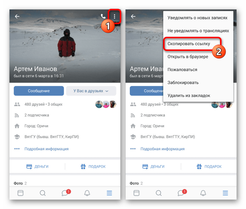 - Перейдите к учетной записи нужного человека и в правом верхнем углу нажмите по значку с тремя точками. Через данное меню необходимо выбрать «Скопировать ссылку».