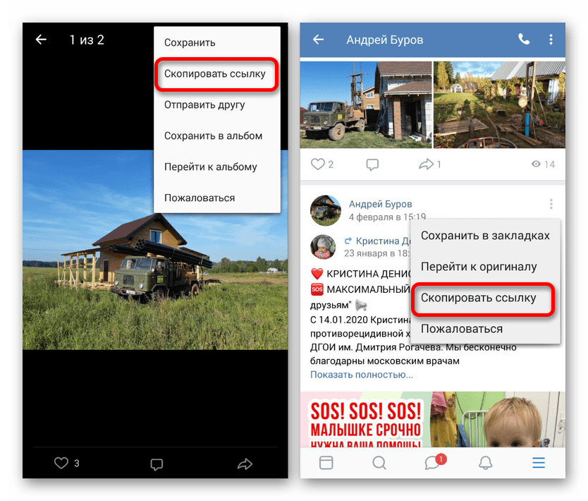 Можете также воспользоваться аналогичной опцией «Скопировать ссылку» у медиафайлов или записей на стене, если пользователь использует уникальный URL. При вставке подобного адреса ID будет размещен после «PHOTO» или «WALL».