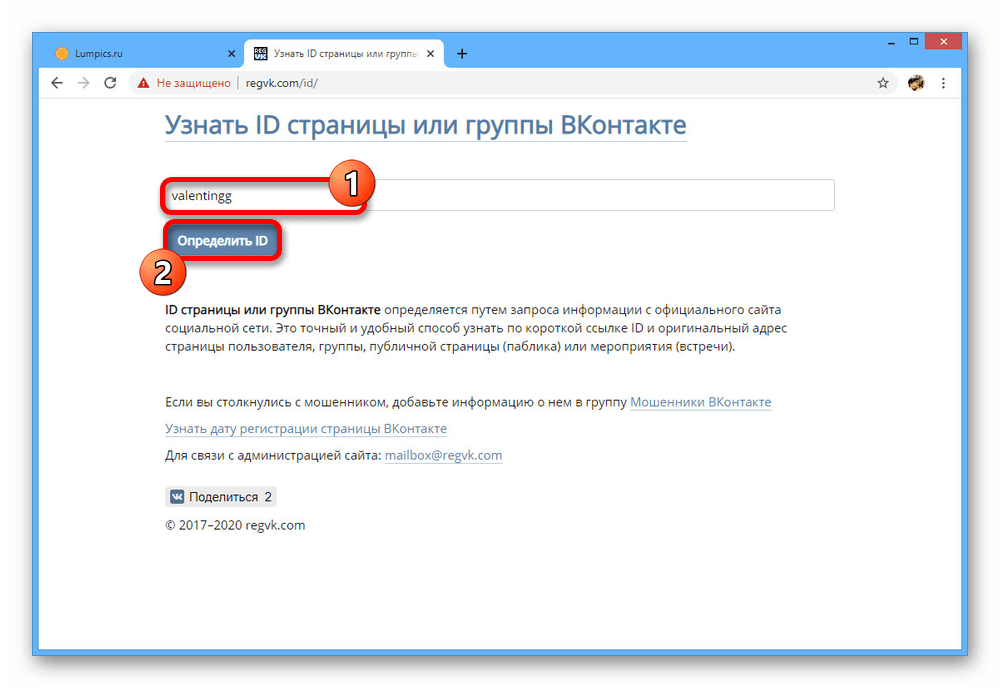 Как можно заметить из вышесказанного, иногда бывают ситуации, позволяющие узнать только короткий адрес страницы, препятствующий вычислению номера. В таких случаях следует воспользоваться сторонними онлайн-сервисами, одним из которых является REGVK.