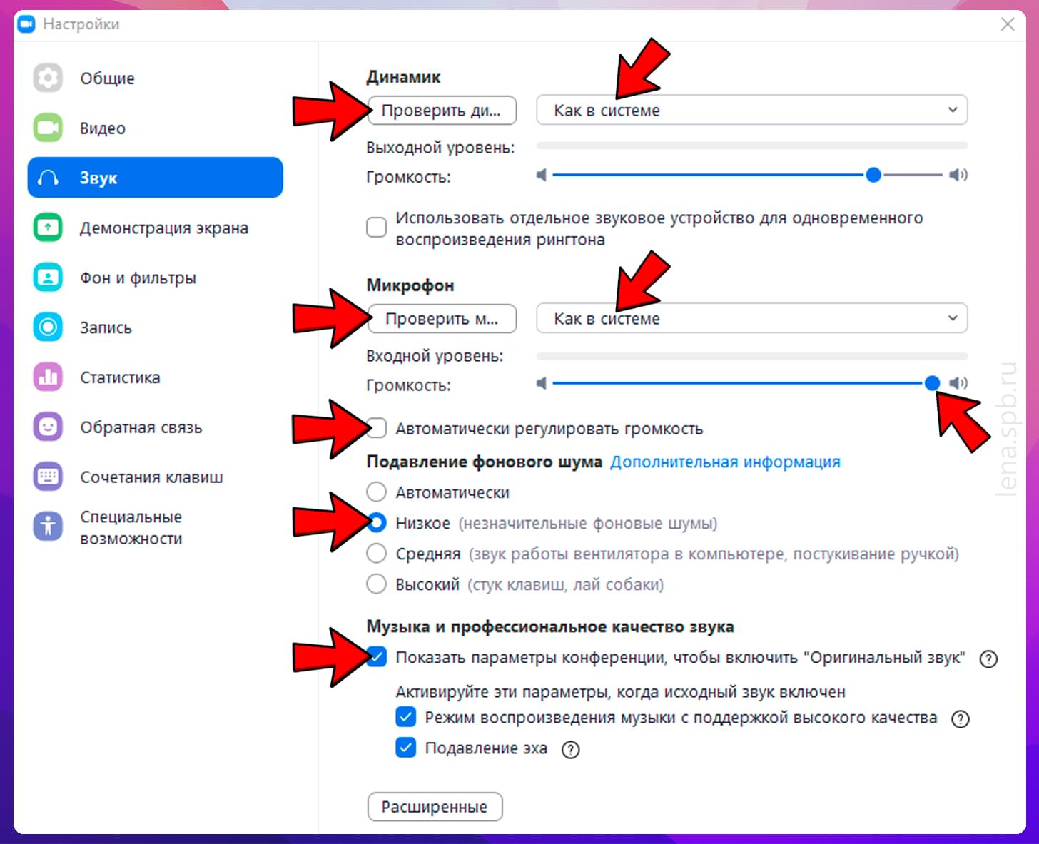 - В разделе «Музыка и профессиональное качество звука», ставим галочку рядом с надписью «Показать параметры конференции, чтобы включить „Оригинальный звук“». Эта настройка запрещает программе заглушать кажущиеся её искажения звуков. Если же этот пункт меню не включен и ребенок вслед за логопедом начинает, например, рычать (пытается сказать звук Рррр), то Zoom будет заглушать эти звуки и педагог на другом конце провода ничего не услышит.