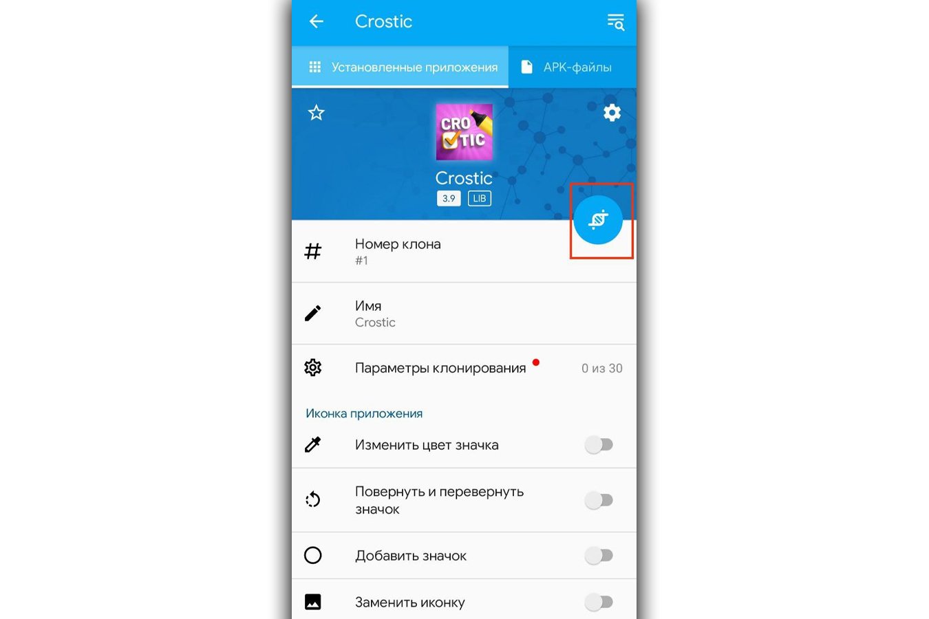 Проще работать с первой программой. Запустите её, выберите «Клонированные приложения», создайте клон. На этом всё. Огромный плюс: можно менять иконку клона, добавлять символы в название – чтобы не путаться.