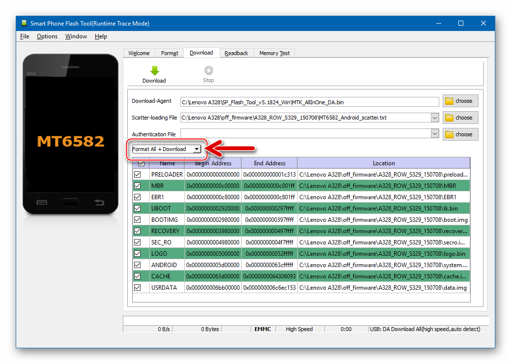 Если и вышеописанный подход (запись разделов в режиме «Firmware Upgrade») не приносит результата – применяем программу в режиме «Format All + Download». Не следует забывать, данное решение потребует после своего выполнения восстановления раздела «NVRAM», поэтому используем полное форматирование только в крайнем случае!