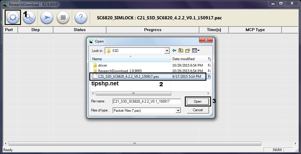 После запуска программы её нужно настроить. Для этого нужно нажать кнопку в виде шестеренки в левом верхнем углу(1), затем выбрать файл прошивки с расширением .pac(2) и дождаться окончания загрузки прошивочного файла в программу(3), статус будет виден в верхнем баре программы, появится название прошивки