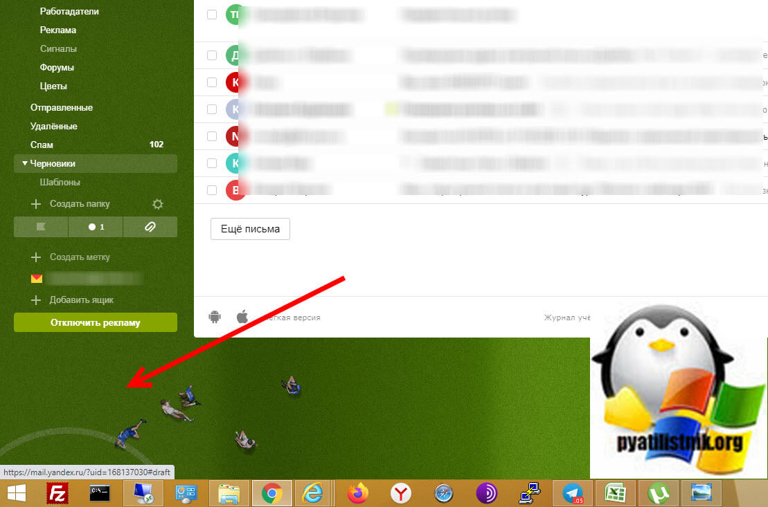 Теперь промотаем вниз и проверим, что в левом углу так же отсутствуют рекламные блоки, которые бесполезны и не нужны в Яндекс почте.