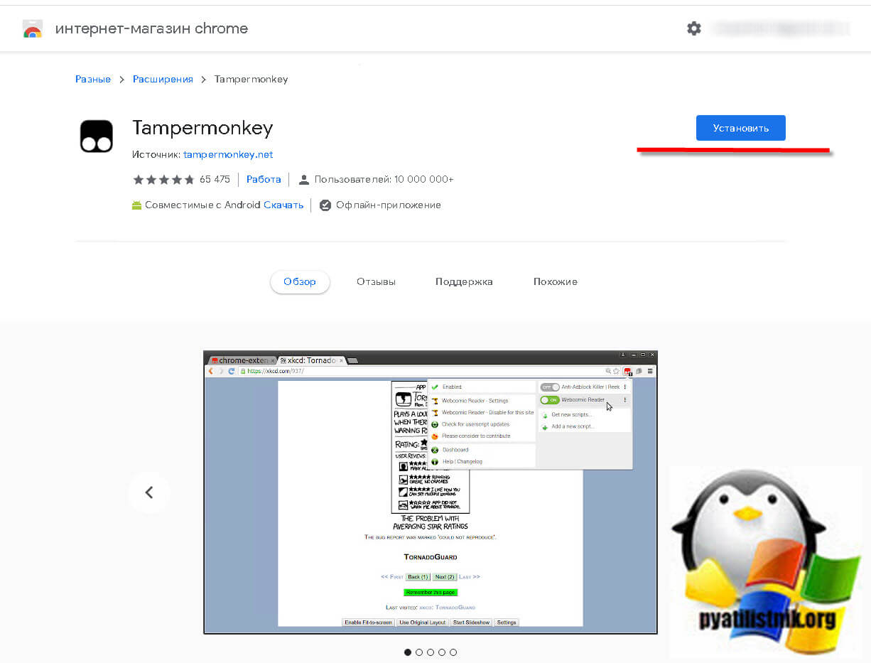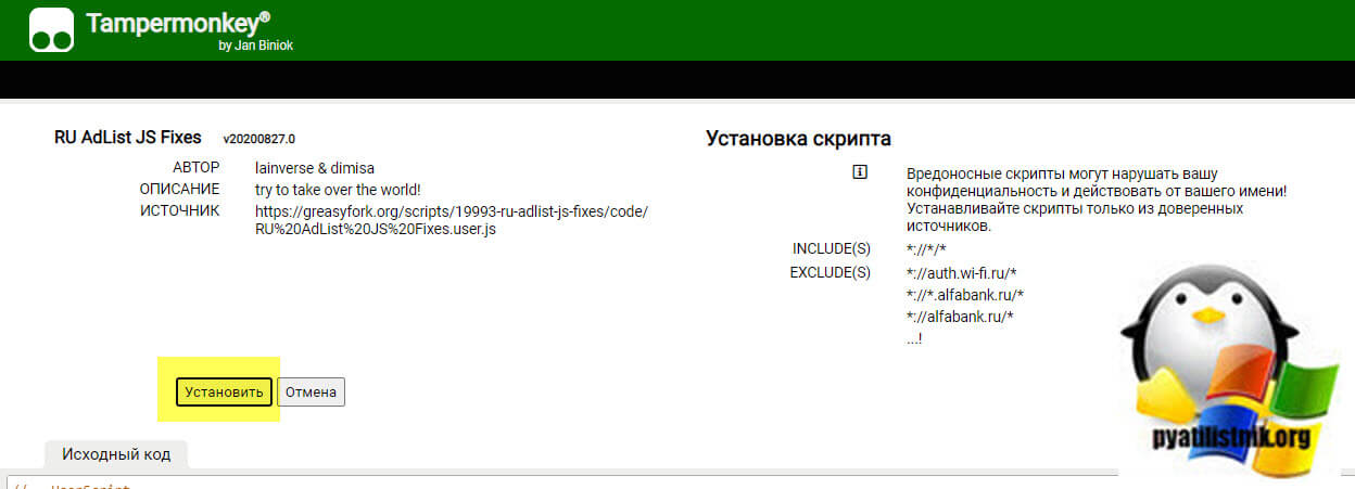 В новом окне Tampermonkey так же нажмите «Установить», вам будет указан источник и описание.