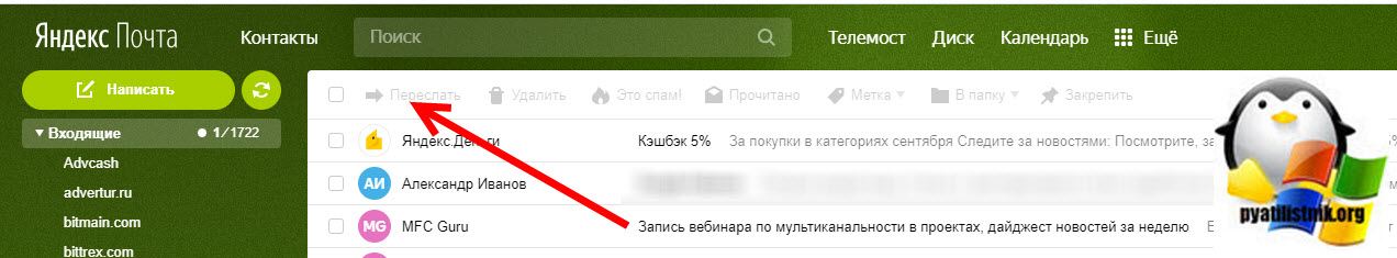 Теперь давайте проверять помогло ли это убрать рекламу в Яндекс почте. Как видите в самом верху над списком писем, уже нет одного рекламного сообщения.