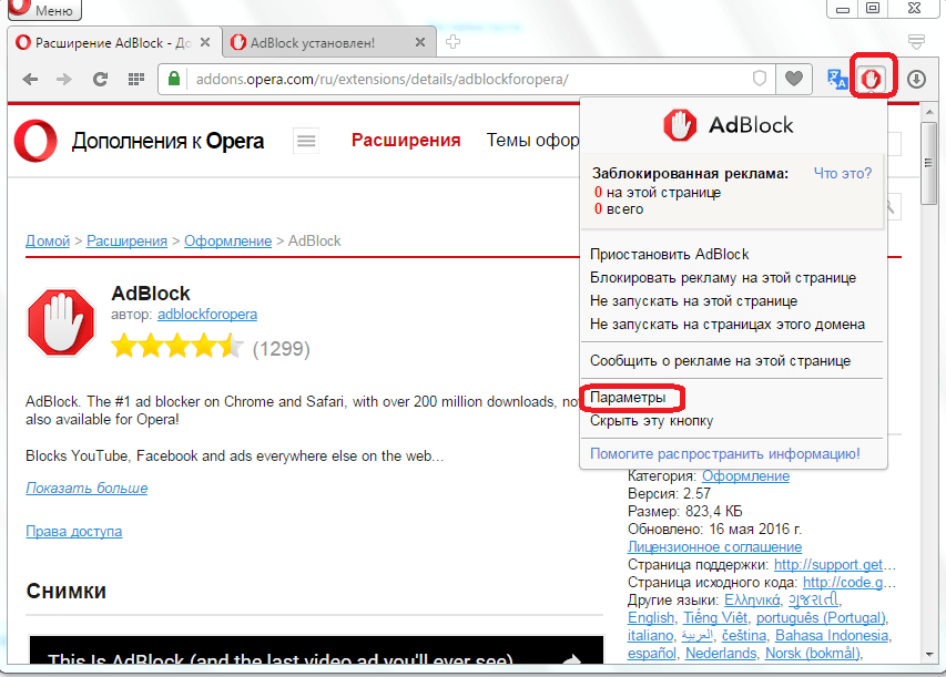Но, при настройках по умолчанию AdBlock блокирует не полностью всю рекламу, а только агрессивную, в виде баннеров и всплывающих окон. Это сделано для того, чтобы пользователь хотя бы частично поддерживал создателей сайта, просматривая ненавязчивую рекламу. Для того, чтобы вообще избавиться от рекламы в Опере, снова кликаем на значок расширения AdBlock, и в появившемся меню выбираем пункт «Параметры».